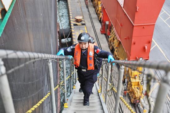 備齊執(zhí)法裝備,戴上安全頭盔,再穿上救生衣,王京義一口氣登上數(shù)十米高的舷梯。還有兩年就要退休的他依然矯健,竟絲毫未見喘氣。梯口督導(dǎo)、證件核對(duì)、船艙檢查,只見他眉頭微蹙、目光專注,每一項(xiàng)工作都一絲不茍。