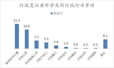 從行政行為事項上看,舉報投訴處理、行政處罰、政府信息公開類案件數(shù)量較多,共占受理總量的69.8%。其中,舉報投訴處理和行政處罰類案件數(shù)量同比分別上升33.0%和27.8%,政府信息公開案件數(shù)量則同比下降31.7%。前五位數(shù)量和占比分別是:舉報投訴處理21.5萬件,占33.1%;行政處罰16.6萬件,占25.6%;政府信息公開7.2萬件,占11.1%;行政不作為5.5萬件,占8.5%;行政確認(rèn)2.8萬件,占4.3%。
