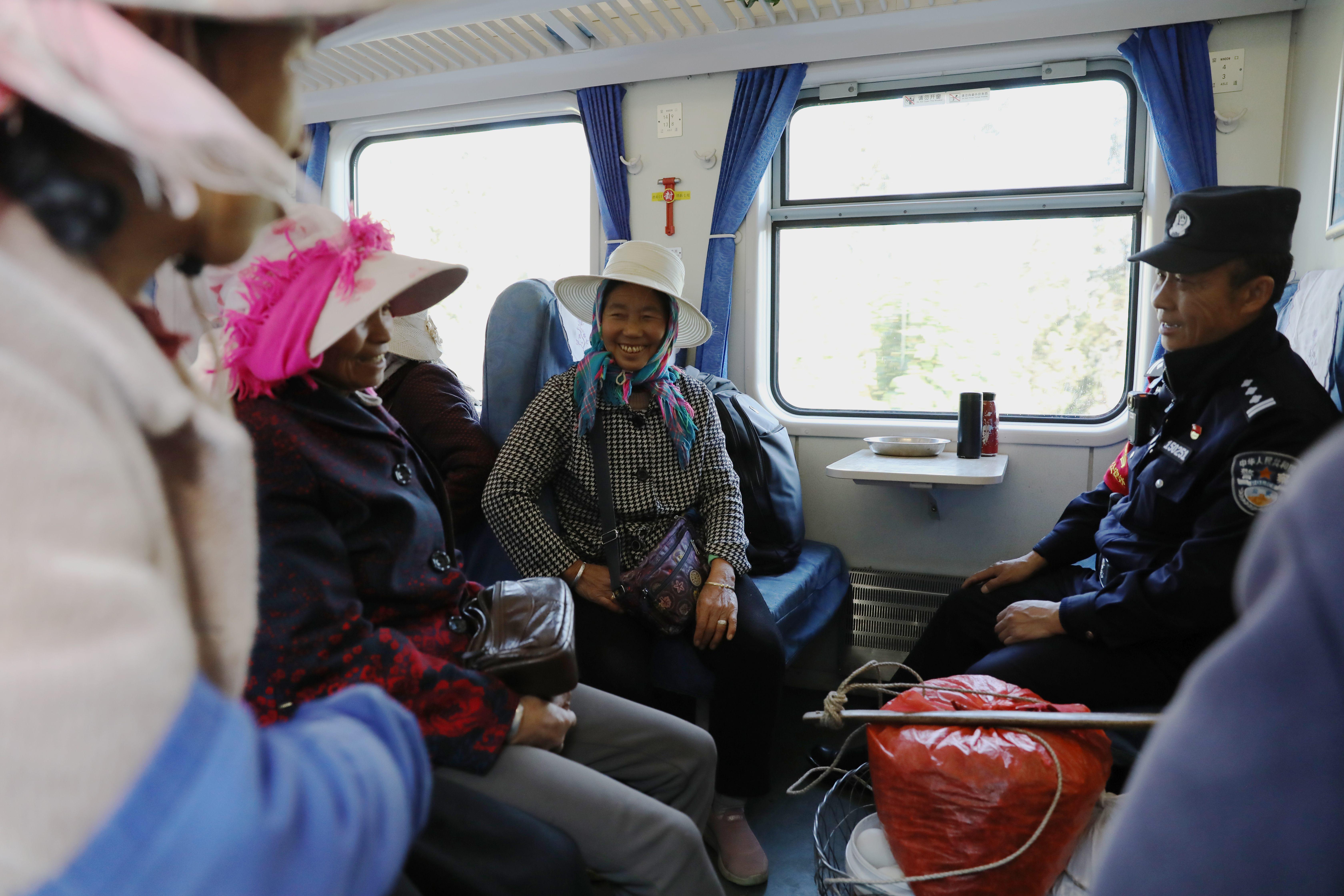 圖為乘警李學(xué)忠和乘車村民們聊天。