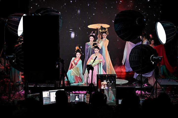 陜西省歌舞劇院的舞蹈演員在直播間進(jìn)行“團(tuán)播”表演(2025年12月25日攝)?!皥F(tuán)播”這一多人演藝直播新形式,正成為專業(yè)文藝院團(tuán)開辟線上“第二舞臺(tái)”、推動(dòng)傳統(tǒng)文化創(chuàng)新表達(dá)的新嘗試?!柏Q屏化”“快節(jié)奏”的改編,讓傳統(tǒng)劇目受到越來越多年輕人喜愛。數(shù)據(jù)顯示,陜西省歌舞劇院“團(tuán)播”單場(chǎng)最高曝光量超500萬,帶動(dòng)線下票房增長(zhǎng)約10%。