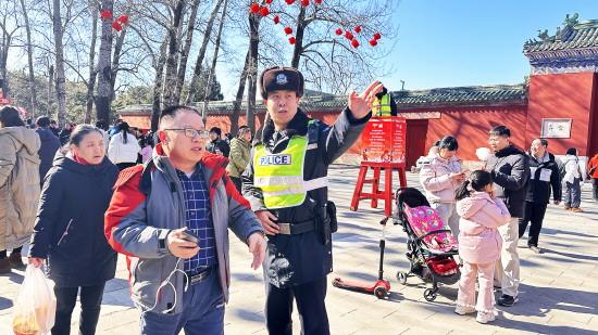 8點30分,隨著舞獅表演開始,第三十八屆地壇春節(jié)文化廟會正式開幕。朱門緩啟,人流向前涌動,與熱鬧喜慶的人群相伴而行的,還有一抹抹藏藍身影,維護秩序、貼心服務,用行動織密安全防線,讓年味更濃、平安更實。