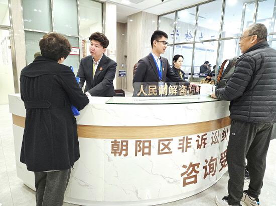 圖為北京市朝陽(yáng)區(qū)非訴訟糾紛化解中心工作人員正在接待咨詢?nèi)罕姟?/span>