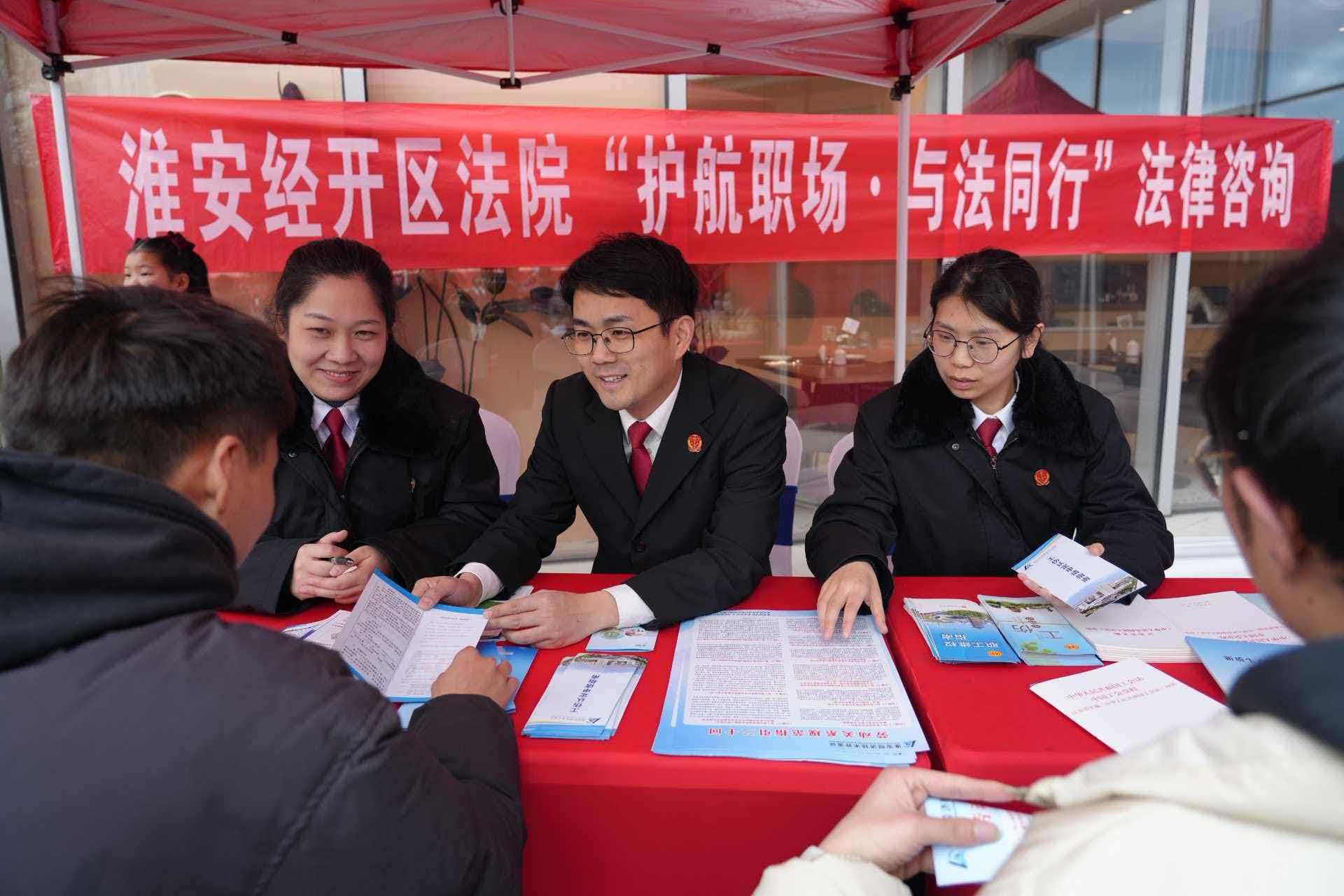 當(dāng)天,江蘇省淮安經(jīng)濟(jì)技術(shù)開發(fā)區(qū)人民法院勞動(dòng)爭(zhēng)議調(diào)處法官團(tuán)隊(duì)將司法服務(wù)“直通車”開進(jìn)了新春招聘會(huì)現(xiàn)場(chǎng)。江淮大地年味尚濃,招聘市場(chǎng)人頭攢動(dòng),法院的服務(wù)攤位前很快圍滿了求職者。