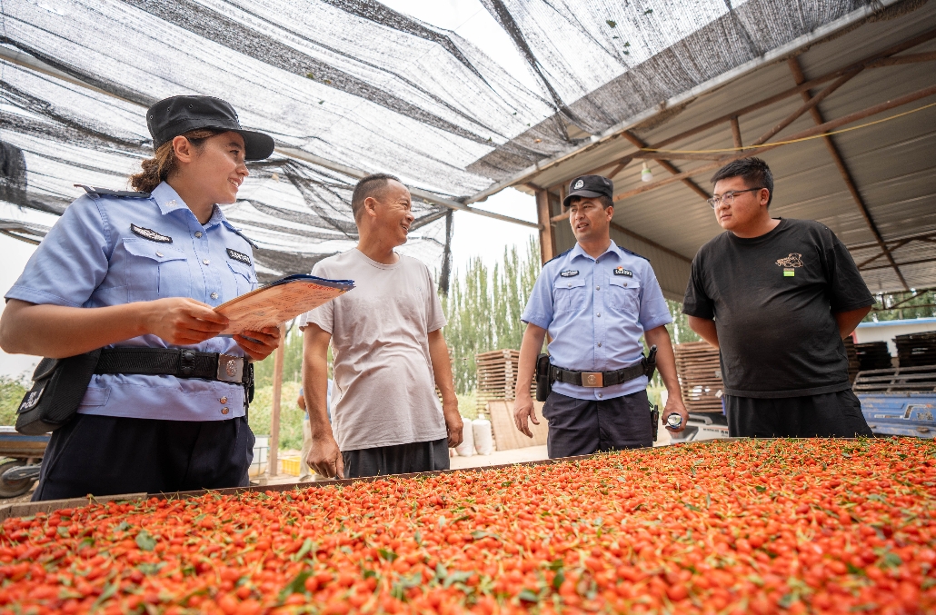 新疆葉城縣江格勒斯鄉(xiāng)的百畝枸杞田碩果滿枝,一串串紅潤的枸杞掛滿枝頭,格外誘人。7月15日,葉城縣公安局結(jié)合轄區(qū)實(shí)際,采取有效措施,把警務(wù)工作融入鄉(xiāng)村振興,深耕“民生警務(wù)”“服務(wù)警務(wù)”,以保農(nóng)、護(hù)農(nóng)、利農(nóng)為目標(biāo),主動(dòng)開展治安巡邏、交通管理、安全宣傳、防火及服務(wù)群眾等工作,全方位、多渠道為枸杞采摘保駕護(hù)航。