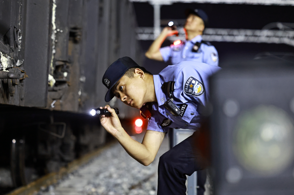 圖為9月23日晚,烏魯木齊鐵路公安局庫爾勒公安處若羌站派出所民警對站停貨運列車進行夜間安全巡視。