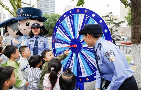 圖為民警通過趣味轉(zhuǎn)盤向市南區(qū)悅府幼兒園小朋友普及日常食品安全知識