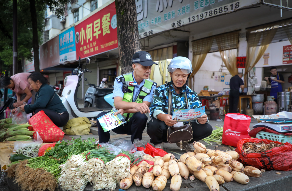 10月15日,江西省宜豐縣公安局交管大隊(duì)組織民輔警深入轄區(qū)早市,向群眾開展以“戴好頭盔、安全出行”為主題的宣傳活動(dòng),擰緊人間煙火氣的“安全閥”。