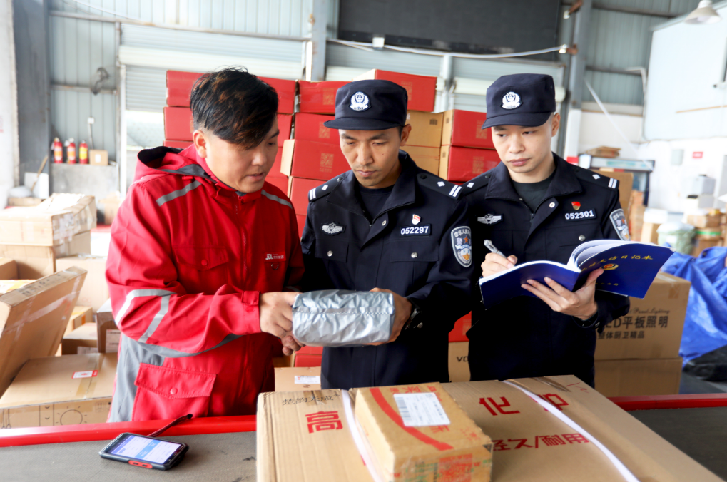 圖為11月3日,民輔警在轄區(qū)寄遞物流企業(yè)開展安全檢查。