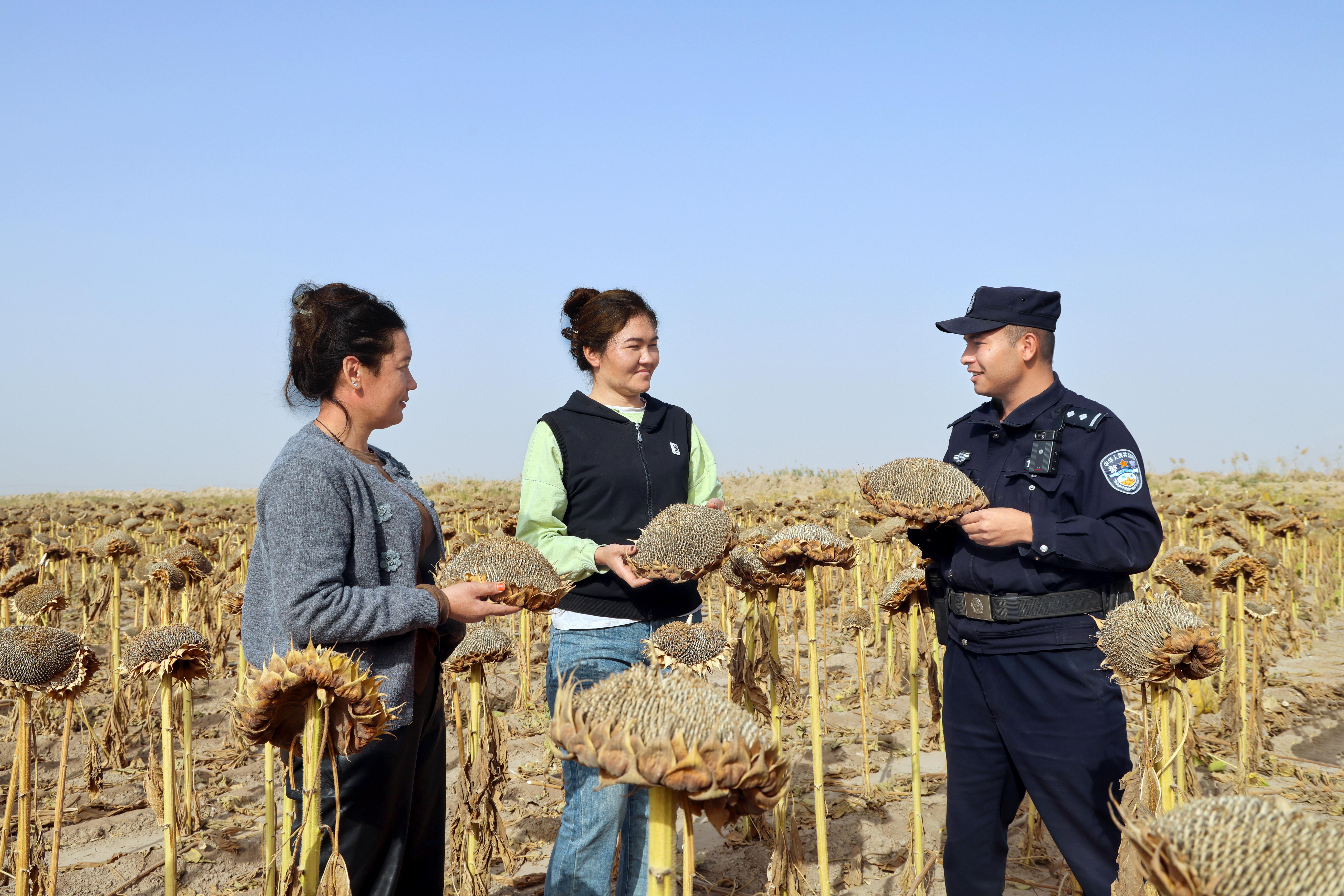 10月29日,新疆巴楚縣萬畝食葵迎來采收高峰。在恰爾巴格鄉(xiāng)庫木加依村的田間地頭,連片的食葵垂下飽滿的花盤,收割機的轟鳴聲與人們的歡笑聲此起彼伏,處處洋溢著豐收的喜悅。在這片金黃畫卷中,一群身著藏藍警服的身影格外醒目——巴楚縣公安局成立的“秋收服務(wù)隊”的民輔警正忙碌其間,他們不僅助力采收解民憂,更將反詐知識帶到生產(chǎn)一線,實現(xiàn)“秋收+反詐”的雙贏局面。