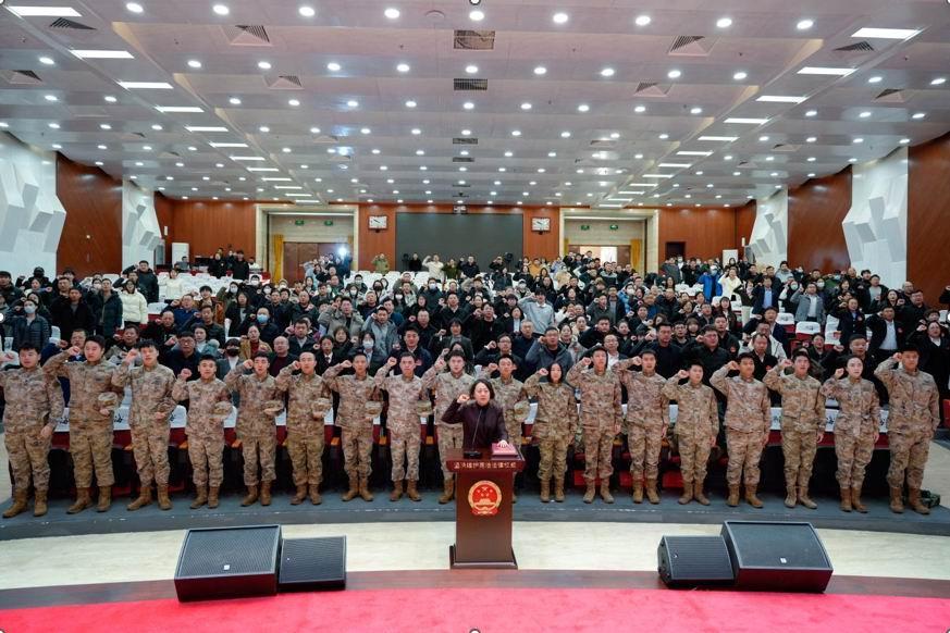 圖為在北京大興區(qū)司法局黨組書記、局長梁曉領(lǐng)誓下,現(xiàn)場300余人面向憲法宣誓。