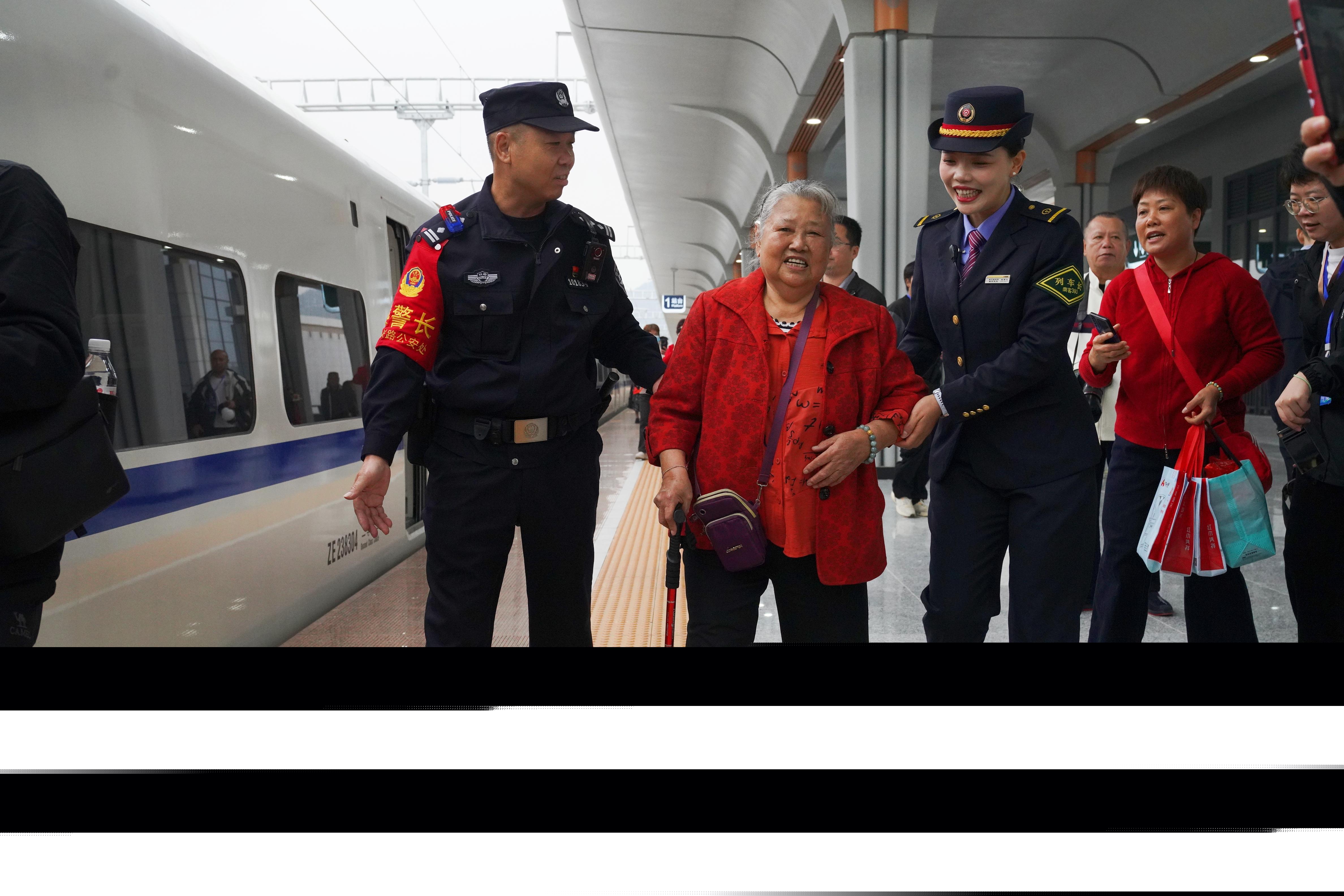 圖為乘警和列車(chē)員攙扶行動(dòng)不便的老人上車(chē)?;粲茼w 攝