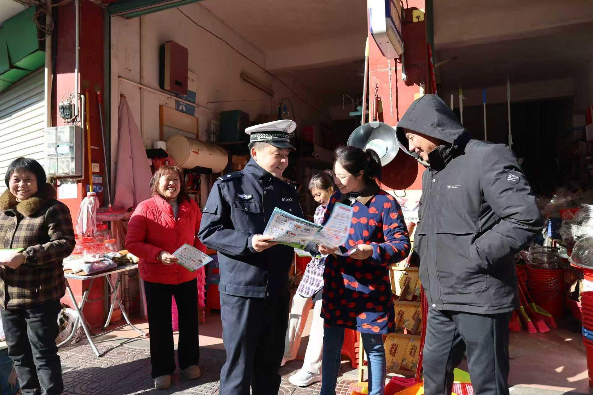圖為12月15日上午,民警在長(zhǎng)勝鎮(zhèn)圩鎮(zhèn)向群眾講解交通安全知識(shí)。
