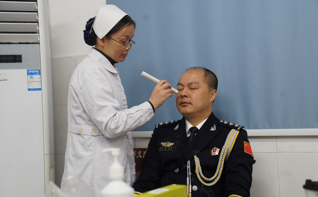圖為南寧市中醫(yī)院醫(yī)護(hù)團(tuán)隊(duì)到南寧鐵路公安處開展義診活動,醫(yī)護(hù)人員為民警艾灸。強(qiáng)志儉 攝