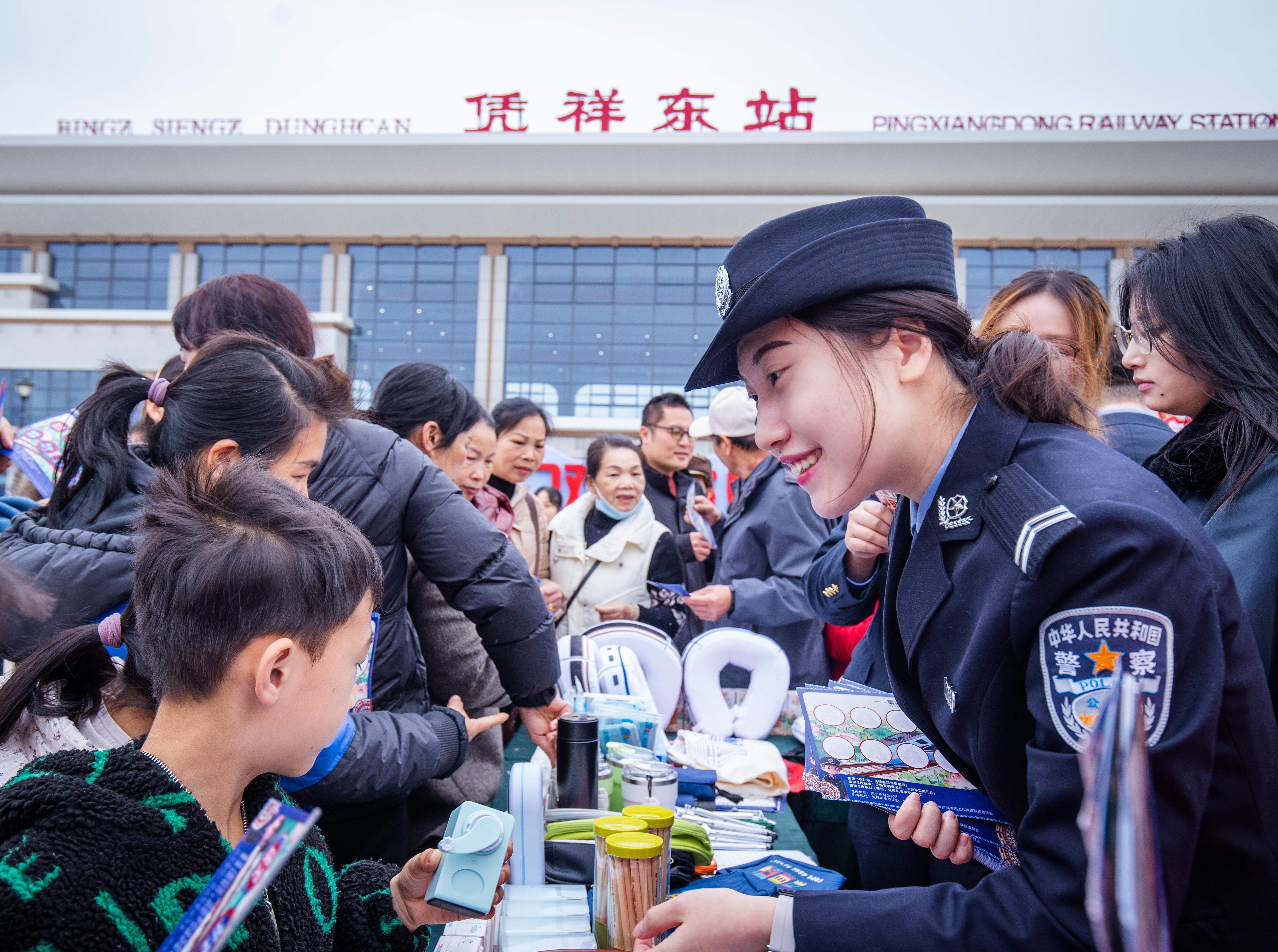 近日,南寧鐵路公安局南寧公安處在憑祥東站站前廣場開展鐵路安全宣傳,通過趣味有獎競答向旅客普及出行安全知識,護航春運平安旅途。