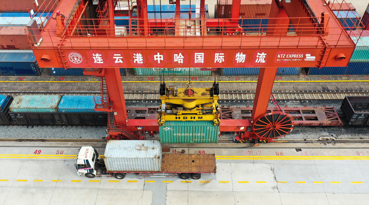云臺山下、黃海之濱,江蘇自貿(mào)區(qū)連云港片區(qū)的中哈連云港物流合作基地,每天數(shù)以百計的集裝箱從這里搭乘中歐班列,駛往中亞。