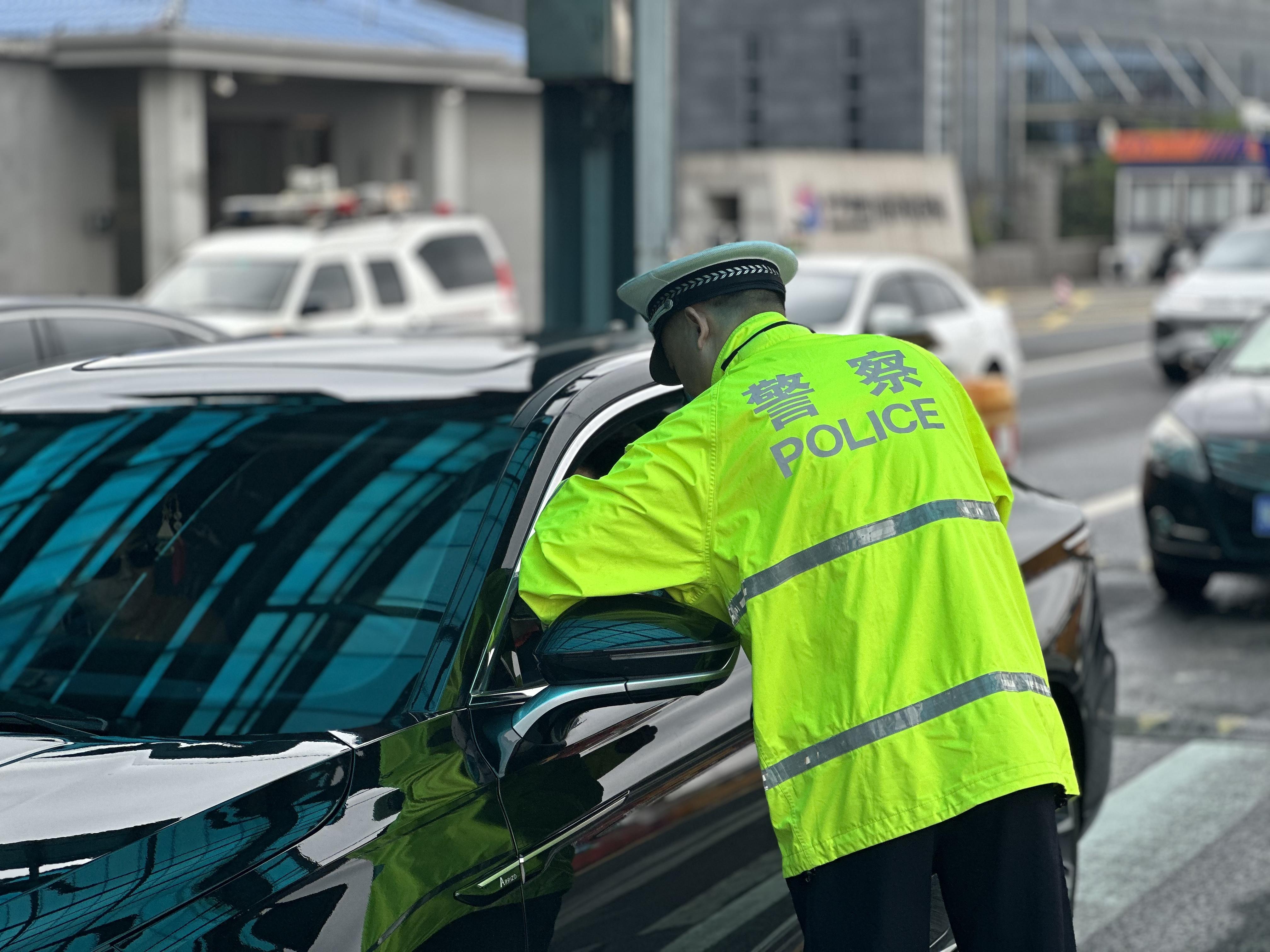 民警幫助司機打開霧燈并做安全提醒。朱海兵 攝