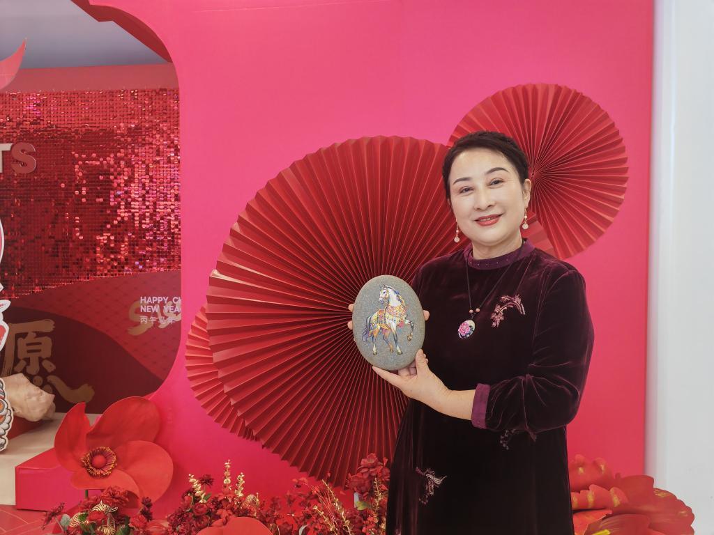 非遺代表性傳承人宋笑珍展示創(chuàng)作的馬年黃河石畫。新華社記者艾福梅 攝