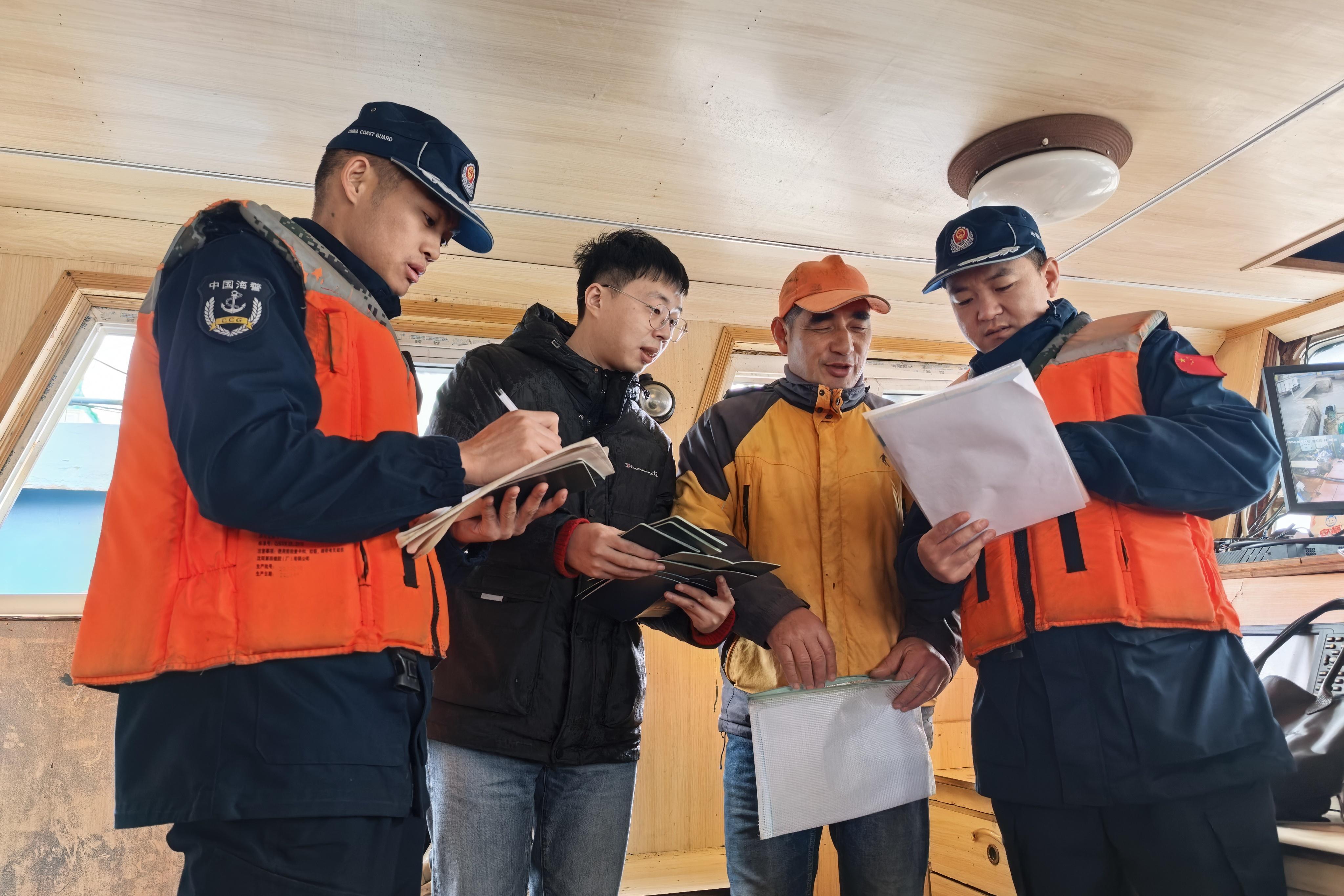 圖為福州海警局連江工作站執(zhí)法員登上返港漁船,查看安全臺(tái)賬。
