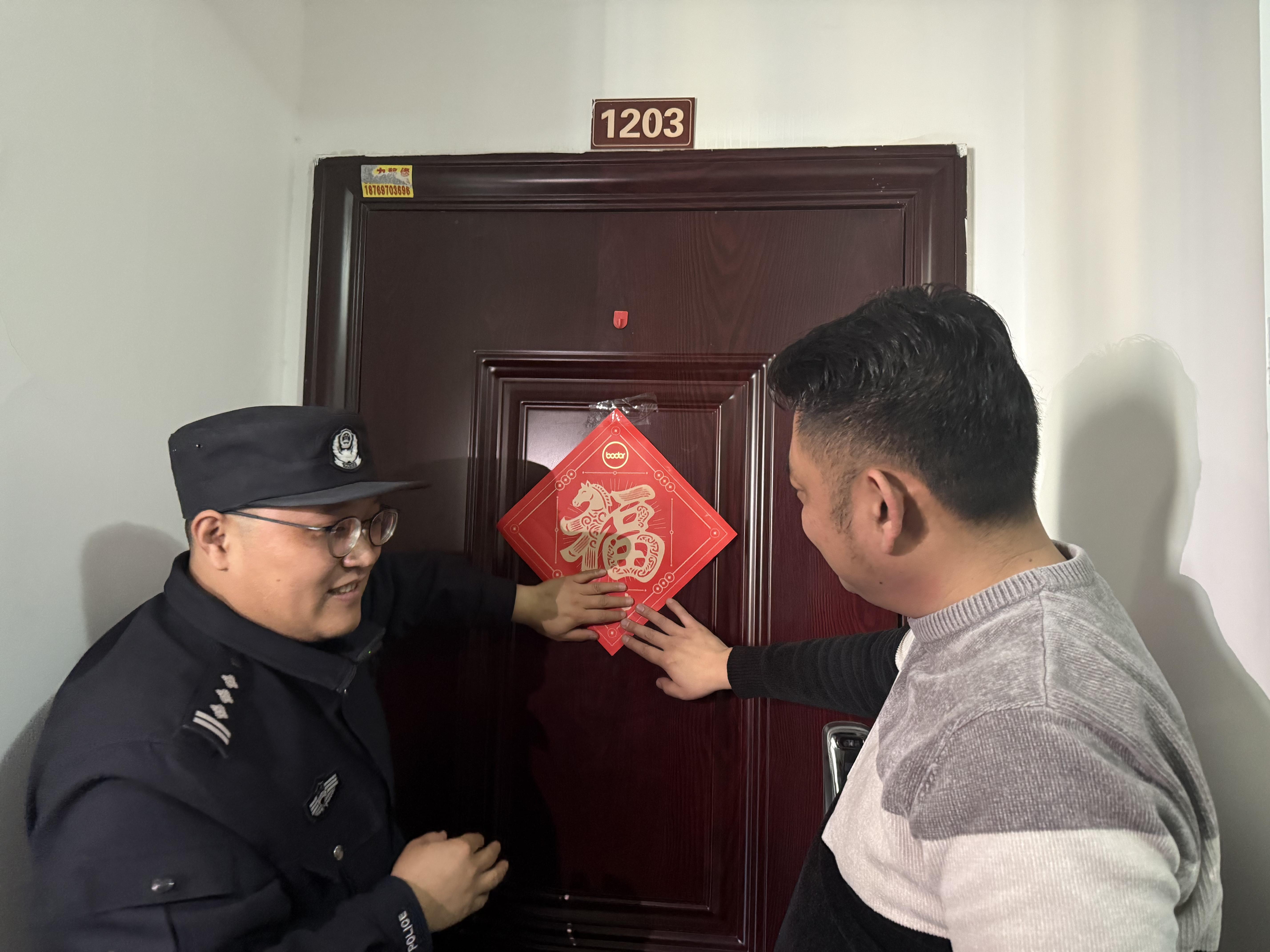 隨后,記者跟隨孫成磊來到虞山新居走訪。清理墻角堆放的紙箱、廢舊家具等易燃雜物,檢查消防栓是否完好無損、應(yīng)急通道是否暢通……在完成社區(qū)安全走訪排查工作后,孫成磊特意來到趙女士及其樓上孫先生家中,為兩戶人家送 “?!?字、貼“?!弊??!懊芙忾_了,煩心事沒有了,民警的‘?!忠菜偷搅?,我們和和氣氣、心情舒暢迎新春?!壁w女士說。