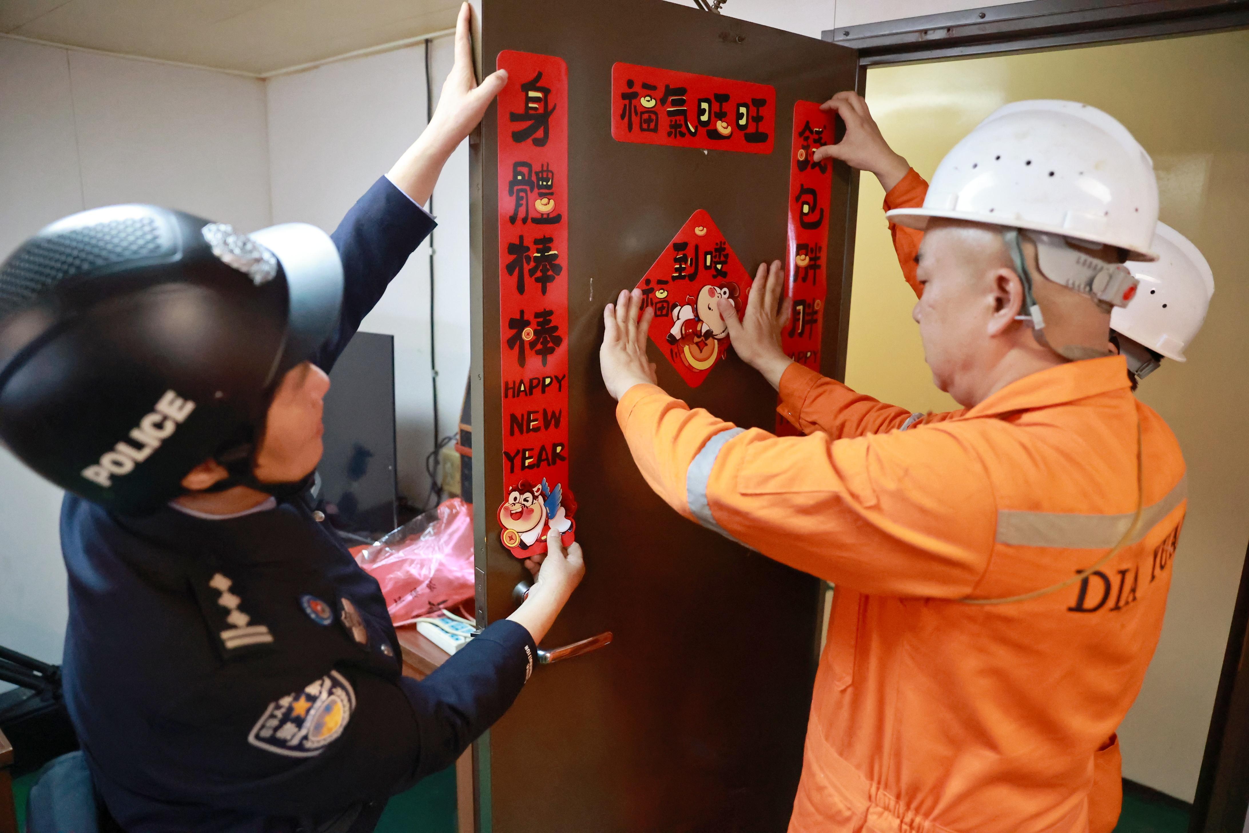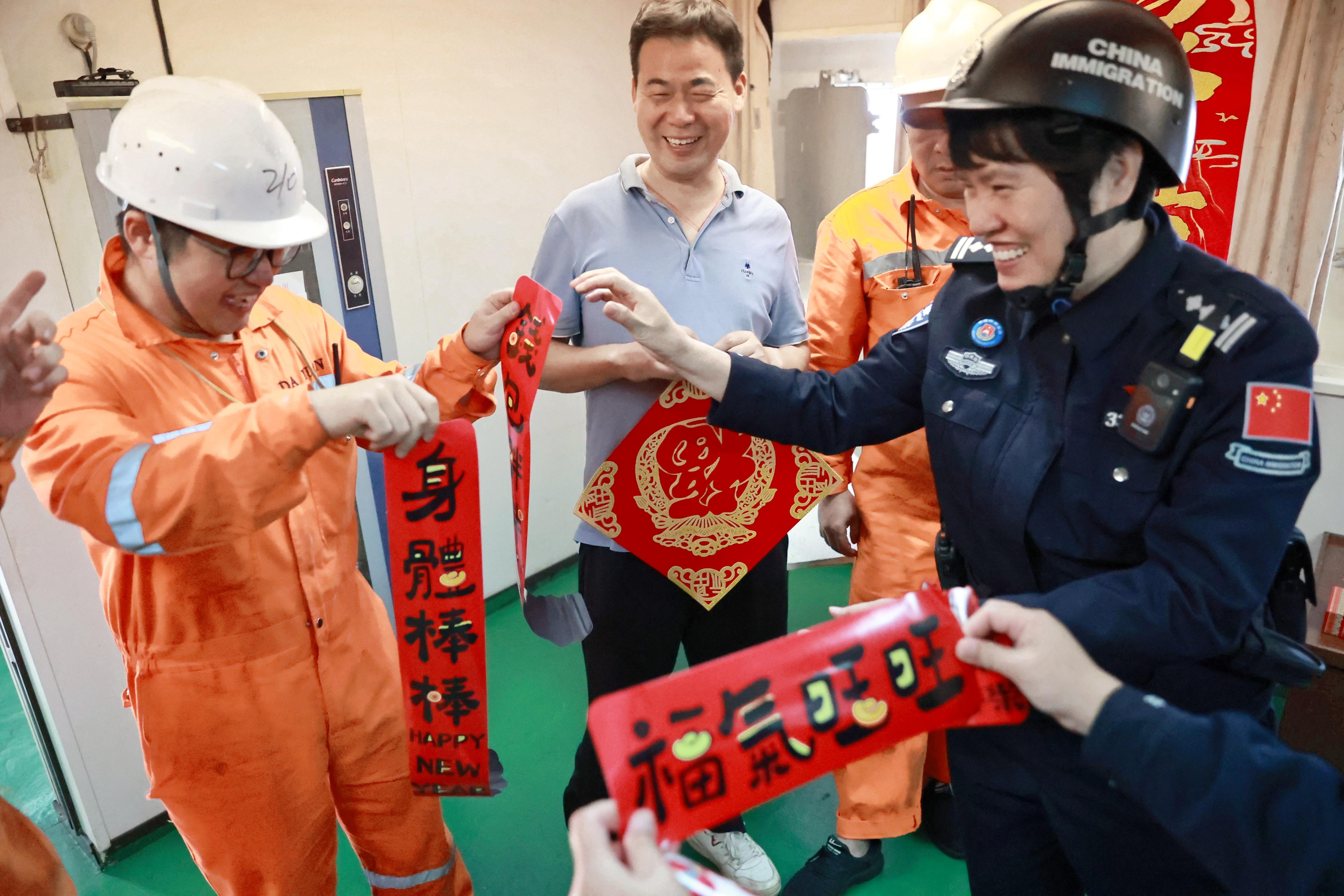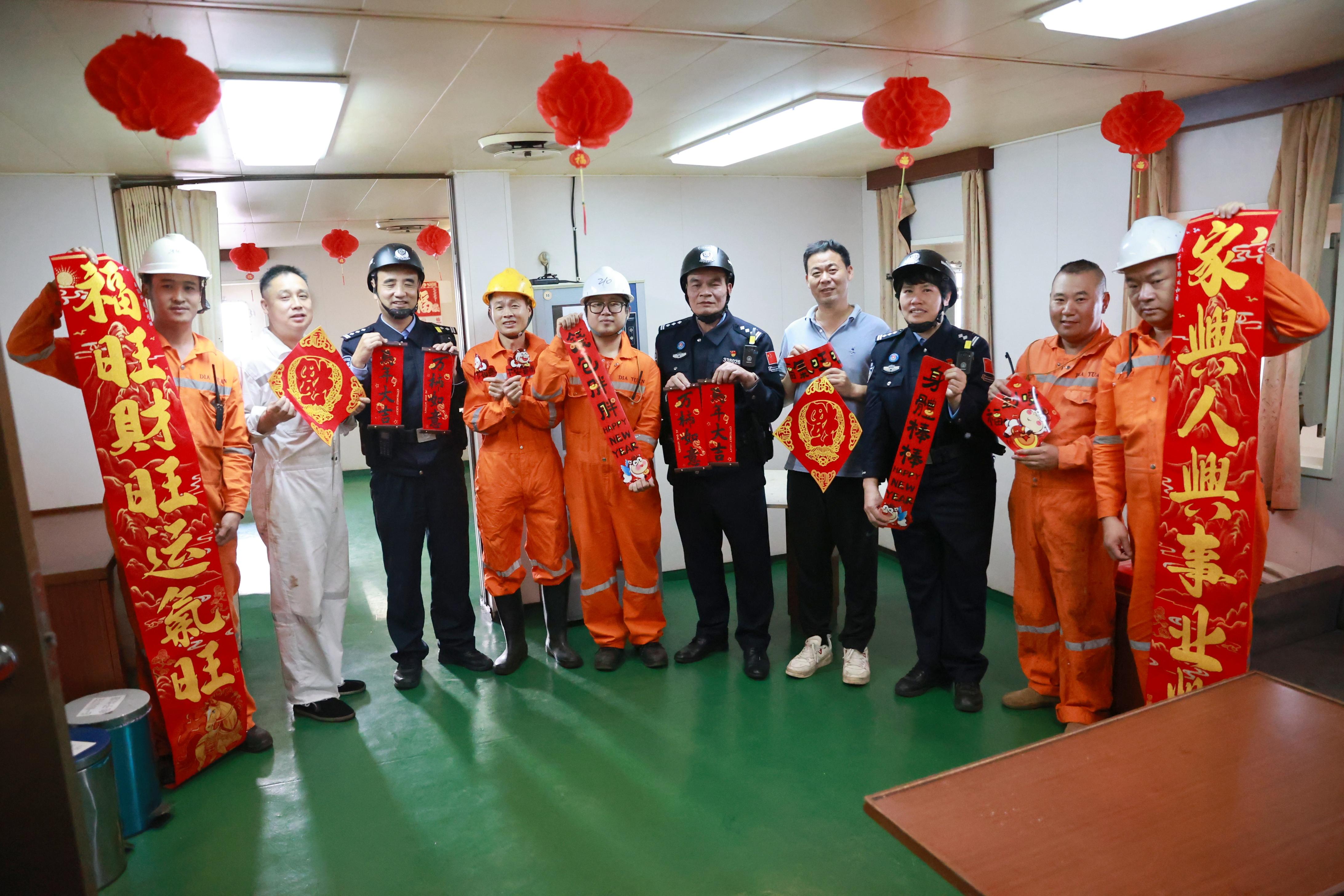 民警們在高效完成船舶查驗手續(xù)后,將一幅幅寓意吉祥的春聯(lián)、紅燈籠和“?!弊炙偷酱瑔T手中,并一同將“?!弊謴堎N在船艙門窗上,原本簡潔的船艙頓時有了過年的紅火氣氛。