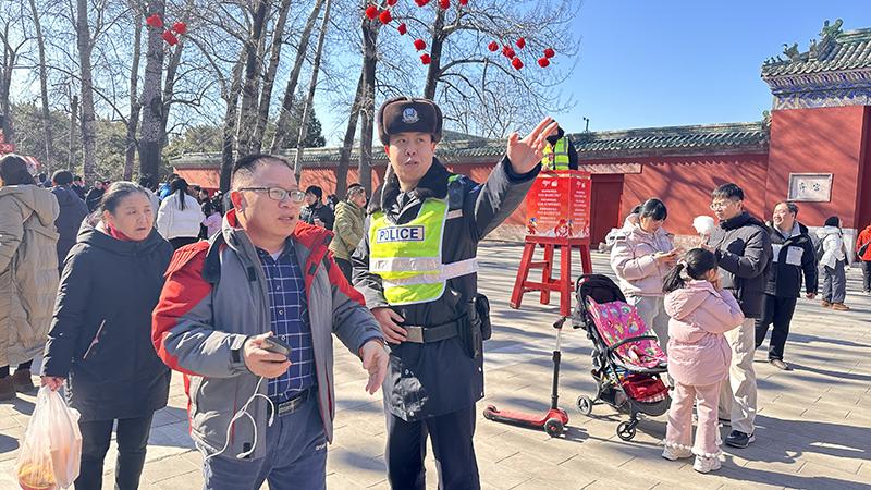 “民警同志,請問地壇南門怎么走?人太多不好找,我和朋友約好了在那里集合?!痹趫?zhí)勤巡邏路上,周雨不斷遇到市民、游客咨詢求助。