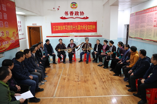 “琵琶到手歌就唱,講個(gè)黨的故事給你聽(tīng),六中全會(huì)精神拿來(lái)唱……”11月19日,在廣西壯族自治區(qū)柳州市三江侗族自治縣政協(xié)辦公室,政協(xié)機(jī)關(guān)干部和部分政協(xié)委員在富有侗族特色的琵琶歌中領(lǐng)悟黨的十九屆六中全會(huì)精神。 梁克川 攝