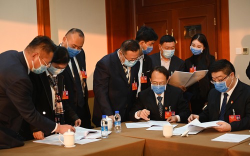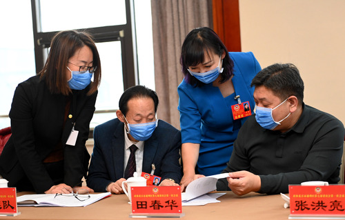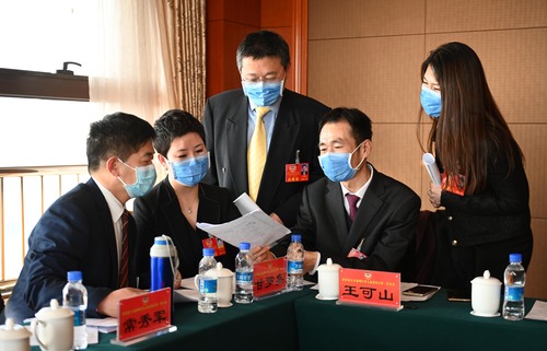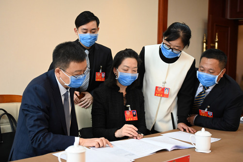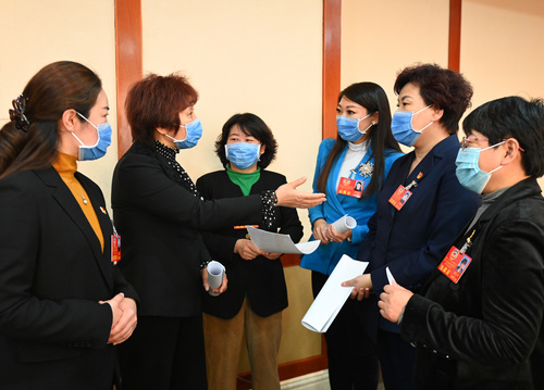 圖為婦聯(lián)界分組討論會間隙,委員們就熱點(diǎn)話題繼續(xù)進(jìn)行討論。