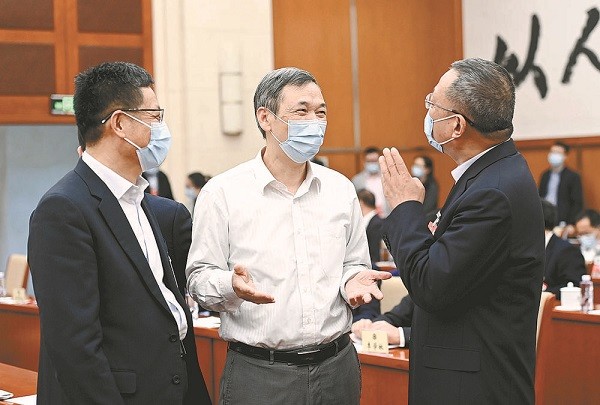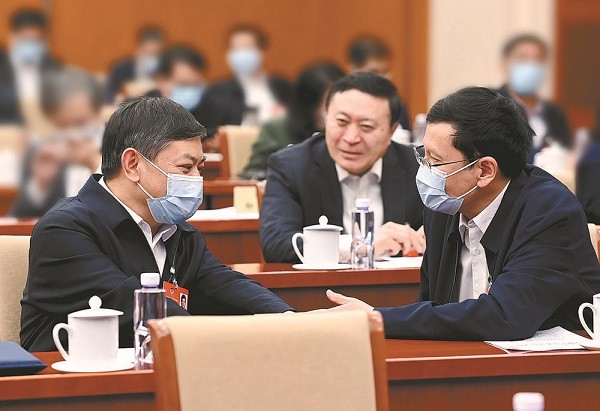 3月7日,在鴻府大廈駐地,黃潤(rùn)秋、喬旭、劉聰(從左至右)三位委員圍繞“深入打好污染防治攻堅(jiān)戰(zhàn)”的話題進(jìn)行討論。本報(bào)記者 齊波 攝