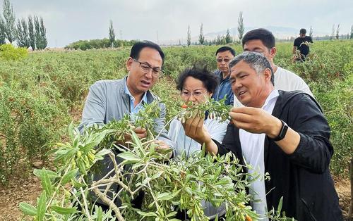 何嘉是寧夏農(nóng)林科學院植物保護研究所副研究員,主要從事枸杞病蟲害監(jiān)測預報及安全防控技術(shù)的研究與示范工作,也是吳忠市紅寺堡區(qū)政協(xié)委員。為做好界別群眾工作,紅寺堡區(qū)政協(xié)根據(jù)優(yōu)勢打造了“何嘉委員會客室”,通過形式多樣的活動,讓當?shù)乩习傩罩鸩秸莆湛茖W種植技術(shù),提高了枸杞產(chǎn)量和品質(zhì),當?shù)厝罕姸颊f:“委員會客室這個平臺特別接地氣,值得點贊!”。圖為6月8日,何嘉委員(左2)和當?shù)卣f(xié)領(lǐng)導及相關(guān)技術(shù)團隊深入田間地頭,查看果實生長情況。(圖文/袁安莉 記者 范文杰 )