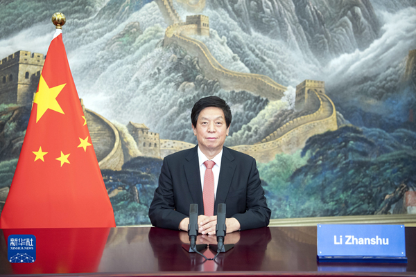 6月27日,全國人大常委會委員長栗戰(zhàn)書應(yīng)邀在泰國國會成立90周年慶?;顒由习l(fā)表視頻致辭。新華社記者?李濤?攝