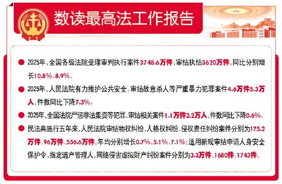 報告著重強調“恪守公平正義”,圍繞“保障高水平安全”“服務高質量發(fā)展”“守護高品質生活”“助力高水平開放”等方面,回顧了2025年人民法院各項工作。