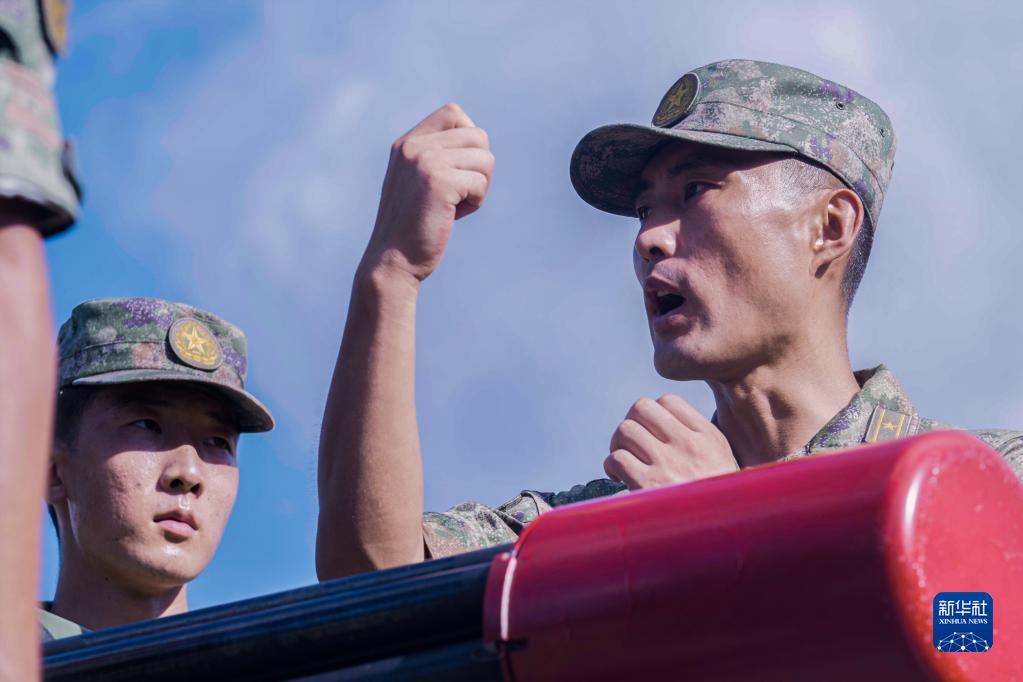 駐香港部隊某團防空營營長王海旭(左)在訓練中下達作戰(zhàn)指令(2022年7月21日攝)。新華社發(fā)(田越洋 攝)
