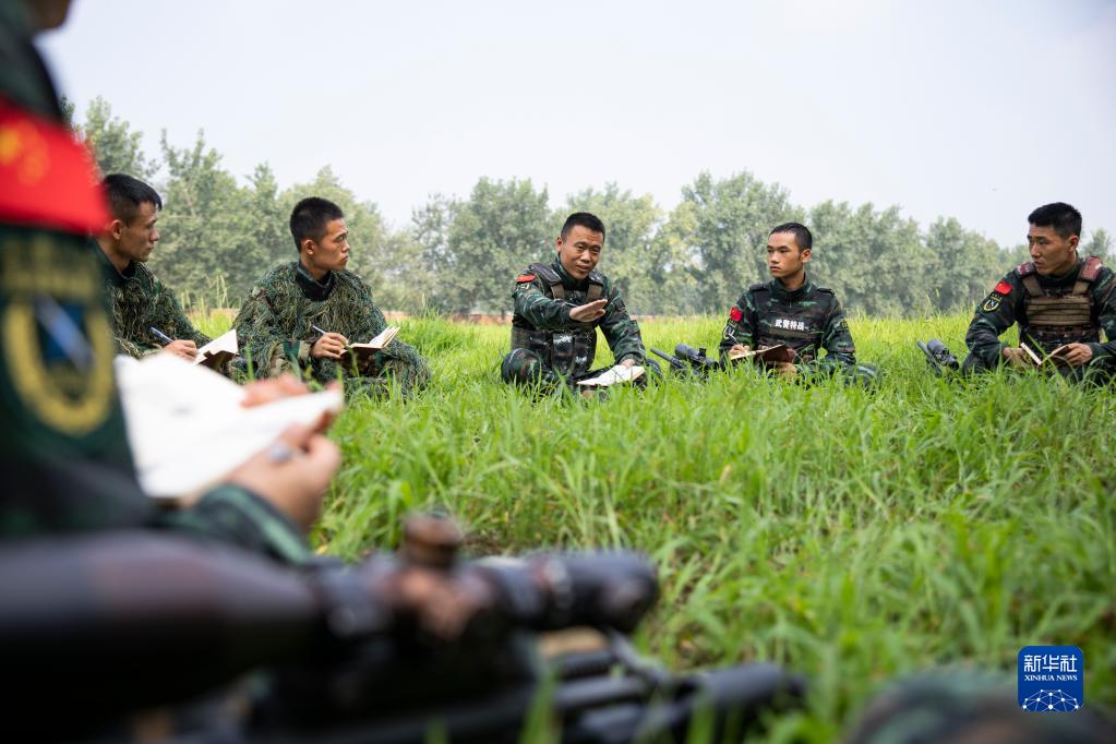 武警河北總隊(duì)某部大隊(duì)長(zhǎng)李闖(右三)和特戰(zhàn)隊(duì)員進(jìn)行理論研討(2022年8月3日攝)。新華社發(fā)(江騰 攝)