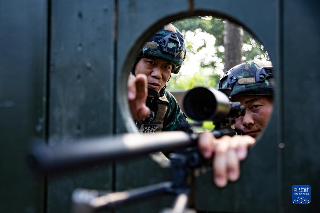 武警河北總隊(duì)某部大隊(duì)長(zhǎng)李闖(左)指導(dǎo)特戰(zhàn)隊(duì)員狙擊訓(xùn)練(2022年8月3日攝)。新華社發(fā)(江騰 攝)