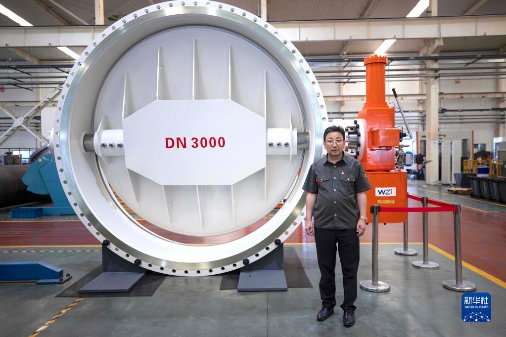 馬玉山在位于寧夏吳忠市的吳忠儀表有限責(zé)任公司自動(dòng)化產(chǎn)業(yè)園數(shù)字化裝配車間中,左側(cè)為該公司生產(chǎn)的DN3000三偏心蝶閥(9月12日攝)。 新華社記者 楊植森 攝