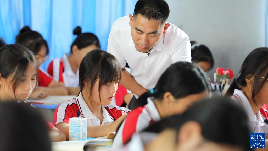 貴州省望謨縣實驗高中黨總支副書記、副校長劉秀祥在課上輔導(dǎo)學(xué)生(2022年8月26日攝)。新華社記者 周宣妮 攝