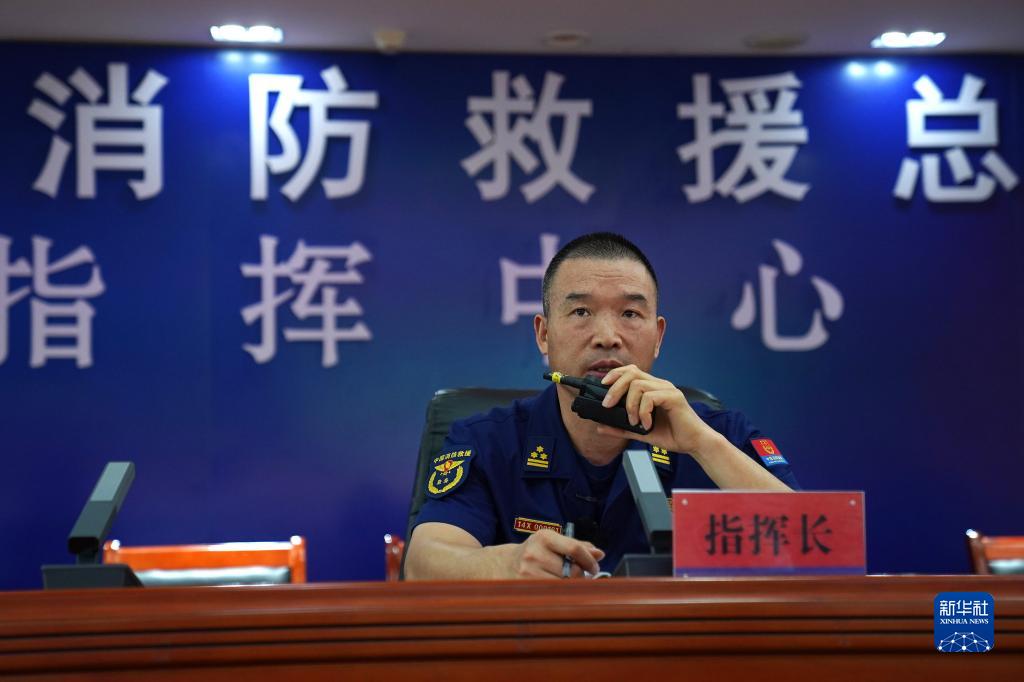 江西省消防救援總隊指揮中心專業(yè)技術(shù)一級指揮長李勝利在江西消防救援總隊指揮中心進(jìn)行遠(yuǎn)程調(diào)度(2022年9月14日攝)。新華社記者 萬象 攝