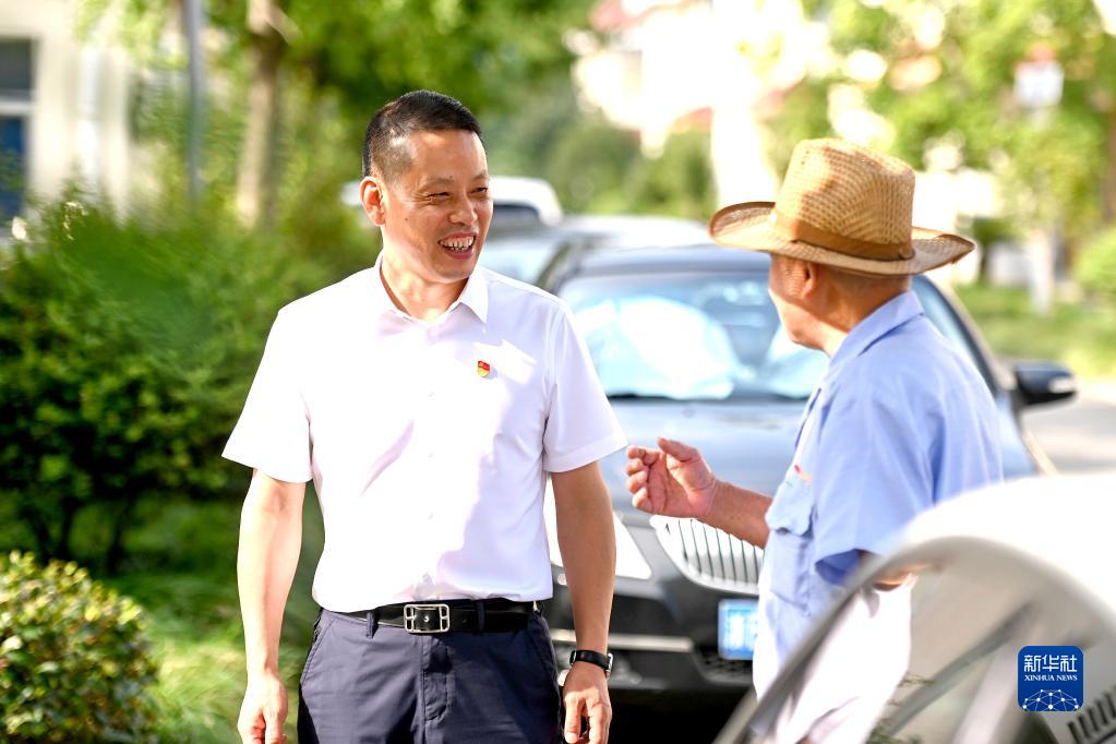 在浙江省寧波市奉化區(qū)蕭王廟街道滕頭村,傅平均(左)與一名老人交談(9月16日攝)。新華社記者 黃宗治 攝
