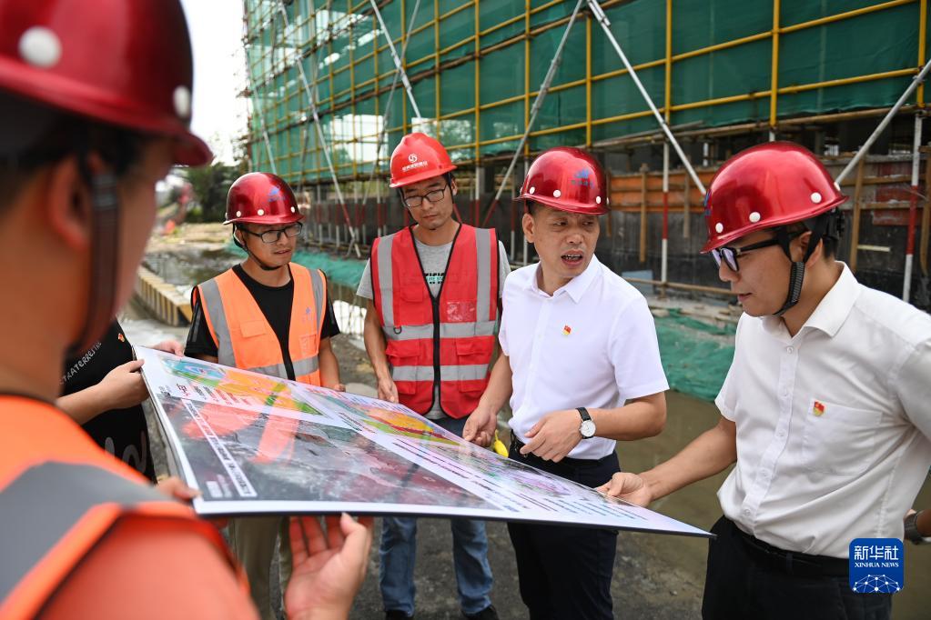 在浙江省寧波市奉化區(qū)蕭王廟街道滕頭村,傅平均(右二)在村黨群服務(wù)中心大樓建設(shè)工地察看施工進(jìn)展(9月16日攝)。新華社記者 黃宗治 攝