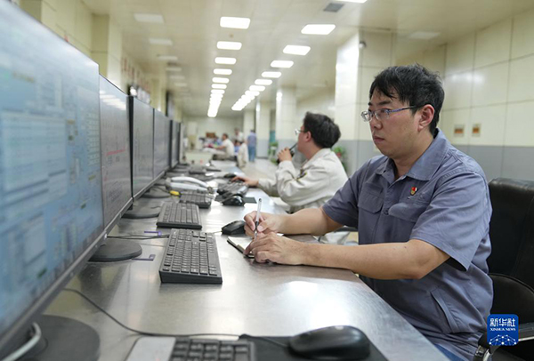 邯寶煉鋼廠特檔技術(shù)主管、轉(zhuǎn)爐車間副主任唐笑宇(右)在轉(zhuǎn)爐車間控制室工作(2022年9月7日攝)。新華社記者 楊世堯 攝