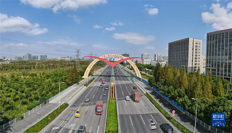 這是中國(guó)(上海)自由貿(mào)易試驗(yàn)區(qū)保稅片區(qū)的標(biāo)志性景觀“海鷗門(mén)”(10月17日攝,無(wú)人機(jī)照片)。新華社記者 方喆 攝