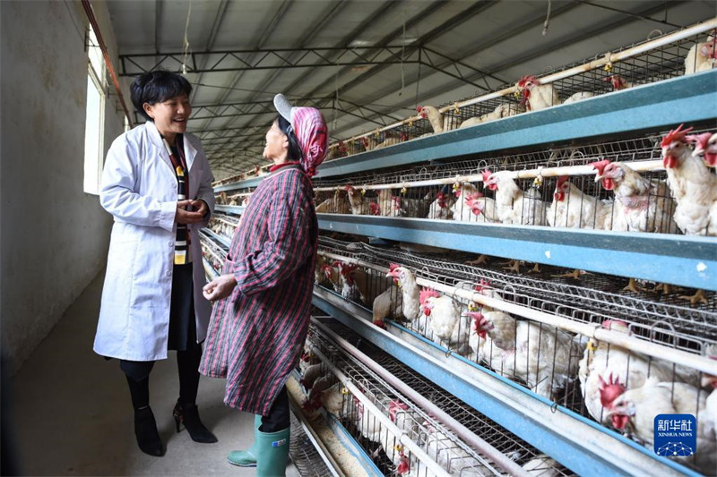 二十大代表余留芬(左)在養(yǎng)殖場內與工作人員交談(2017年10月29日攝)。新華社記者 歐東衢 攝