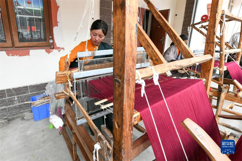10月16日,在四川阿壩汶川縣映秀鎮(zhèn)漁子溪村,織工在紡織牦牛絨披肩。新華社記者 唐文豪 攝