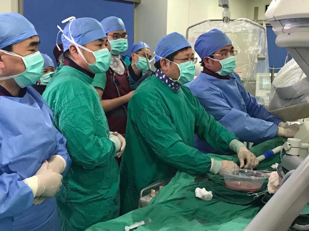 圖為潘文志(右一)及其團隊正在實施經(jīng)導(dǎo)管瓣膜介入手術(shù)。