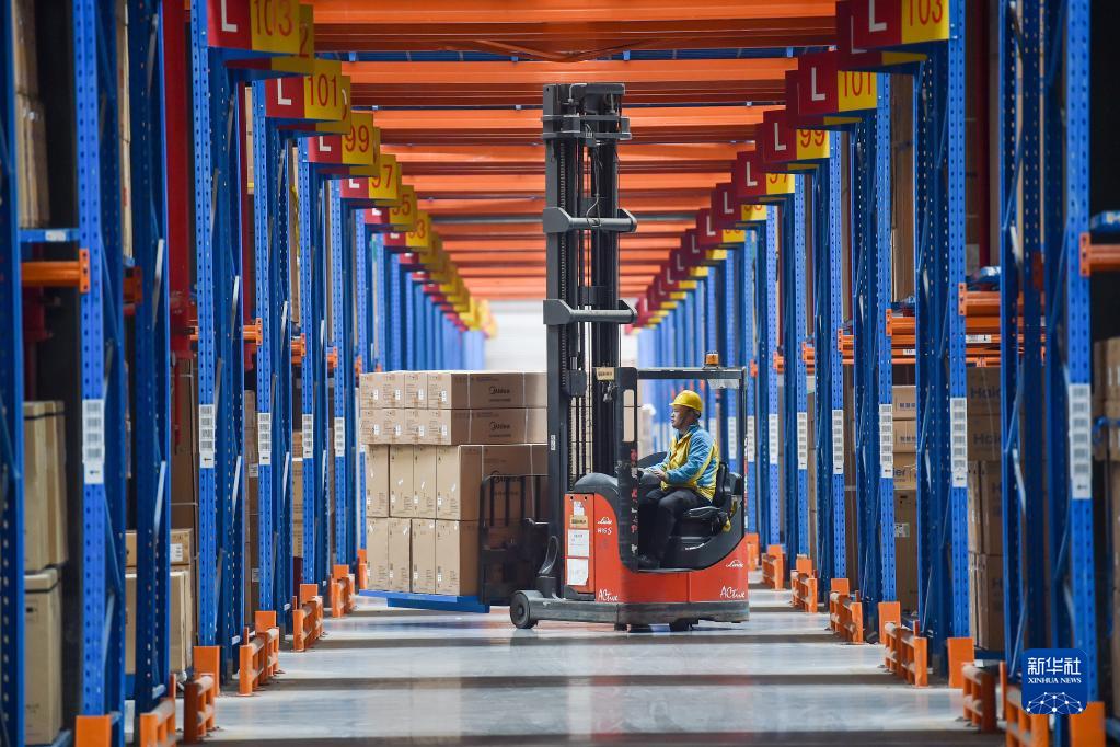 在位于江蘇省南京市江寧區(qū)的蘇寧華東物流中心,工人駕駛叉車搬運商品(2022年11月10日攝)。新華社發(fā)(方東旭 攝)